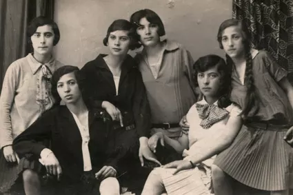 This is a photo with my mother, Alzbeta Urban, née Grunfeld. My mother is the young lady sitting on the left. The photo was taken in Trnava in 1928 at Atelier Nagy. My mother was born in Trnava in 1913. I don't know how many siblings she had. We knew only one of her brothers. He appeared at our place after World War II. It was a very hectic time. I can't even tell you anything more about him.