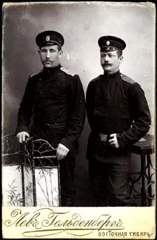 This is my father, Girsha Farbirovich, he is 24 years old here. His friend and colleague V. Pelsh is beside him (first name unknown), who gave him this picture. The picture was taken in Eastern Siberia, in Beryozovka village, where they were serving in the army. They are both wearing military uniform. The picture was taken in Lev Goldenberg's photo-studio, there is his name on the picture, and an inscription: 'Eastern Siberia.' There is a dedicatory inscription in purple ink on the back of the picture written to Father by his friend: 'To be kindly remembered for a long time by my respected friend and colleague G. Farbirovich. V. Pelsh. 26th September 1909, Beryozovka, frontier post. Take a look at the picture and remember me.’