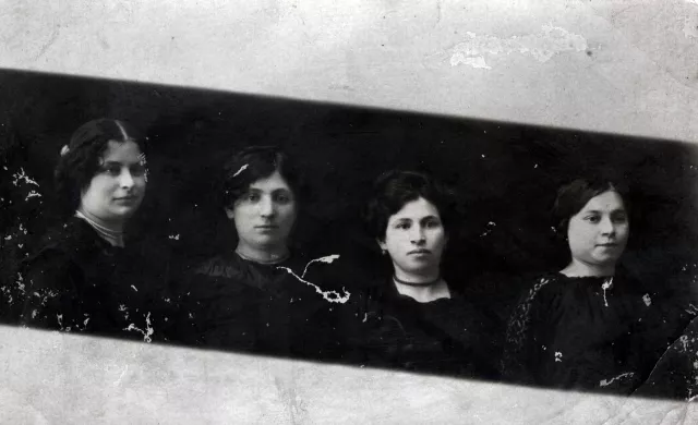 From left to right: an unknown relative, Beile Lurye - the wife of my uncle Meishke, my mother Chaya Gurevich (nee Lurye), my aunt (my mother's sister) Rokhl Gopina (nee Lurye). 1912 ; Konotop.