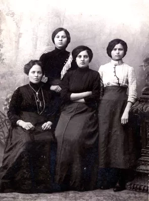 My mother Golda Katz (sitting in the center) before she got married, photographed with her mother, my grandmother Bluma Gass (sitting in the left) and her younger sister Haya Gass (standing) and her friend is on the right. I don't know her name or her story. This photo was taken in Ozarintsy in 1918.