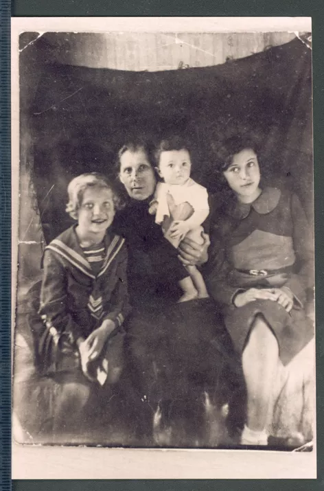 This is may Grandmother Mea with me and my sisters, her grandchildren. I am sitting to the left in the sailor suit, and I'm 8 years old. My younger, year old sister Anya is being held in Grandmother'' arms. To the right is my elder sister Bronislava. Here she is already 12.