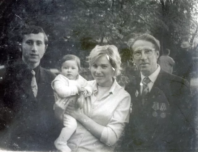 This is me, Grigoriy Fihtman (the first from the right) with my son Alexandr Fihtman, his wife Inna Fihtman and daughter Maya. This photo was taken in Mogilyov-Podolskiy town in 1973. This photo is taken on the 1 of May when we were walking about the town. The weather was nice and all of us were happy then.