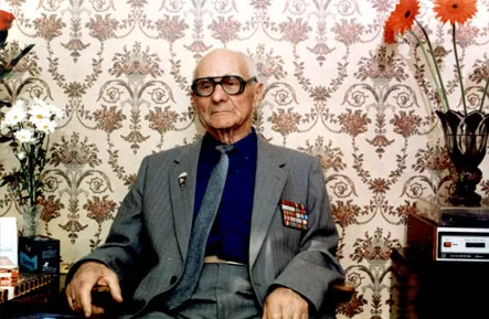 I, photographed at home on 9th May 2004. This photo was taken in Kiev. My orders are on my jacket on the left side: 2 orders of Red Banner, an order of the Patriotic War Grade II, combat field awards; an order of the Patriotic War Grade II awarded by the 20th anniversary of the victory in 1965. Below is a badge of a parachutist and a badge dedicated to graduation from the Leningrad Military Academy of Communication. On the right are medals for defense and liberation of towns and medals awarded by commemorative dates of the Victory and jubilees of the Soviet army and its Air Forces. This photo was taken in Kiev in 2004.