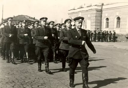 Officers of our AACD Northern Corps on the 1st May parade. I, colonel Grigoriy Kagan, chief of communication of the AACD Northern Corps, marching in the head of the column of officers of the army headquarters on the 1st May parade. This photo was taken in Arkhangelsk in 1958.