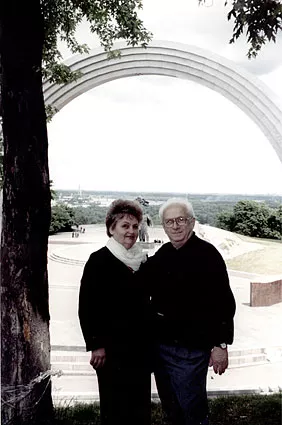 I, Grigoriy Stel'makh, and my wife Lubov during a walk in the city photographed with the Arch f 'Friendship of people' in the background. This Arch was installed on the picturesque slopes of the Dnieper in the 1980s to symbolize eternal friendship of Russia and Ukraine. Kiev, 2002.