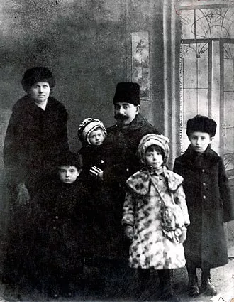 My father Isaac Stel'makh's family. From left to right: my grandmother Yenta Stel'makh, my father Isaac Stel'makh, my grandfather Abram Stel'makh holding my father's sister Sarrah, my aunt Adel Stel'makh, my uncle Moisey Stel'makh. This photo was taken in Khmelnik in 1916 on the occasion of my father's birthday. He was born on 28 February. This is a studio photo.