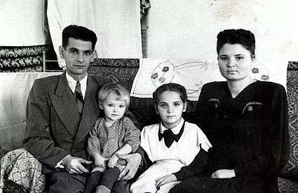 My brother Grisha's family in Kuvandyk in 1954. From left to right: Grigory, his daughters Anna and Luba wearing school uniforms, Grisha's wife Nadia.