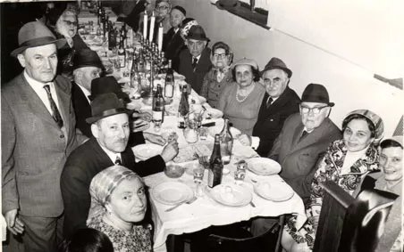This was at Pesach, on Seder night. Back then there were a lot of people on Seder nights. The first person on the right is my sister-in-law, the third wife of Marton, next to him is me, then the fourth lady with glasses is my step-mother. On the left side are Bozsi Huszar, Jozsef Grunstein, my husband, and the person who is standing is my brother-in-law, Marton Grunstein. He used to say: ‘When people greet me, I return the greeting, yet I know it wasn’t for me, but for my little brother, Jozsef’, for they resembled a lot.