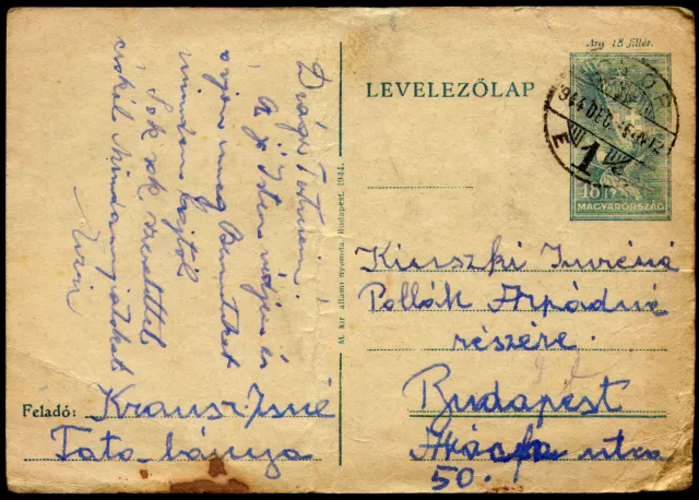 This is the postcard from my aunt Gyongyi Pollak [addressed to Imre Kinszki], Akacfa Street 50. She sent it when they were deported. She knew that we would be taken there, to the ghetto, and she knew this address. Tatabanya, that's where she must have thrown it into the post, I suppose.