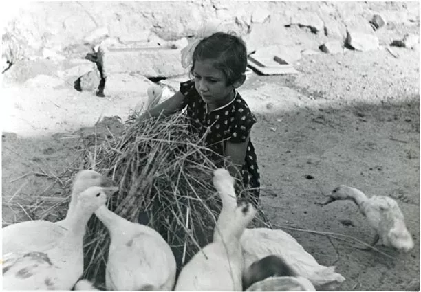 When we were older we spent the summer in Romhany. Our maid was from Romhany, and my mother sent her with us to Romhany. Her father didn't live, but her mother did, and they had a house on the main street of Romhany. It was a farmhouse with big trashing-floor and stacks. They were farmers; she had several siblings, so it was a nice big family. We didn't go barefoot, our sole didn't endure it, but we wore sandals, though everyone else in the village went barefoot, except when they went to church on Sundays. But after a while we could also go barefoot on the stubble. It was strictly forbidden to play in the stacks, because it was dangerous, but we still ran up and down between the stacks. Our maid wore many skirts, everyone in the village wore skirts, they had a very nice national dress. On Sundays the girls, who had braids with a long ribbon at the end, walked along the street arm-in-arm, singing, and the boys walked behind them in boots and black trousers. When my mother was also there she wore national costume from there, and we did, too. I had a national costume Romhany, I also had an aigrette, and when I was a little girl at the end of the school year, on the 15th March we wore national costumes. We spent three or four summers in Romhany, but then the maid got married and we didn't go anymore. The maids always got married after working for us.