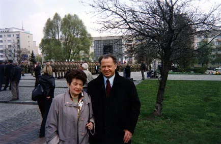 This picture was taken in Warsaw, in 2003. It's me and my son, Wlodzimierz Leszczynski. In the background you can see the Heroes of the Ghetto Monument. My son and I go to the anniversary celebrations each year, on 19th April.