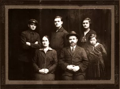 This is our family. Standing from right to left: I, Hana Muchnik, my older sister, Elka Muchnik, and my brothers Haim and Anchel Muchnik. My parents Duvid and Golda Muchnik are sitting. This photo was taken in the Elzon Photo Studio in Orhei before Haim moved to Palestine in 1927.