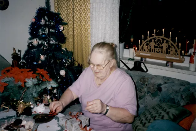In this picture you can see my second wife Hannelore, unwrapping Christmas presents. The picture was taken in our apartment in Carlsbad around the year 2000. The photograp was taken by our son Matias.