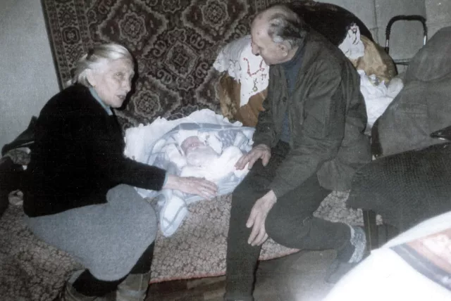 I, Hava Goldshtein, and my great granddaughter Sarah-Revekka, in a week after her birth. Ruvim Tseitlin, husband of my deceased sister, is beside me. Photo made in Lvov in 2002.
