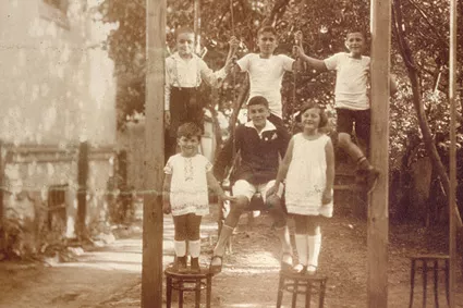 This photo was taken in Piestany in our friends’ yard, probably in 1924. Upper row from left: Pavel Ringwald, Ladislav and Michal (Miki). Standing in the bottom row am I (Heda Ambrova), my cousin Karol Kürti and my sister Magda Erdelyiova.