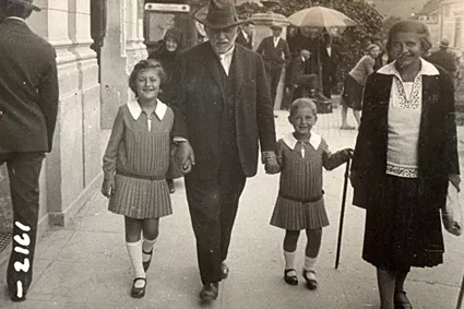 This picture was taken in around 1925 in Piestany. It shows us on a walk with our grandfather, whom we loved. On the left is my sister, Magda Erdelyiova, then our grandfather, Benedikt Duschnitz, I (Heda Ambrova), and a pharmacy student, Miss Heger, who worked in our father’s pharmacy.