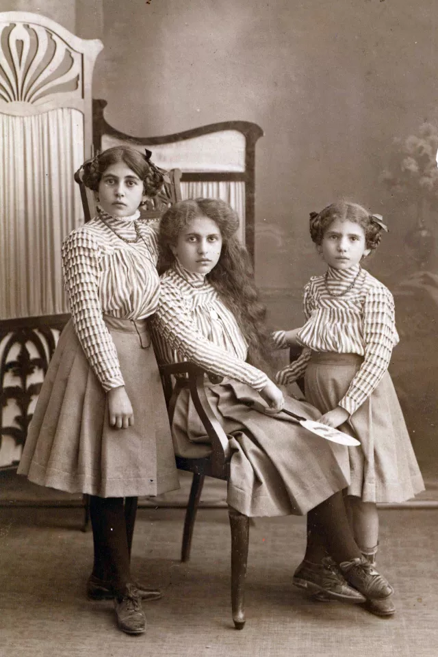 These are the Schonfeld sisters around 1907. The photo was taken in Bucharest. From left to right: my mother, Henriette Mizrahy [nee Schonfeld], Mina Solomon [nee Schonfeld], and Annie Segalescu [nee Schonfeld].