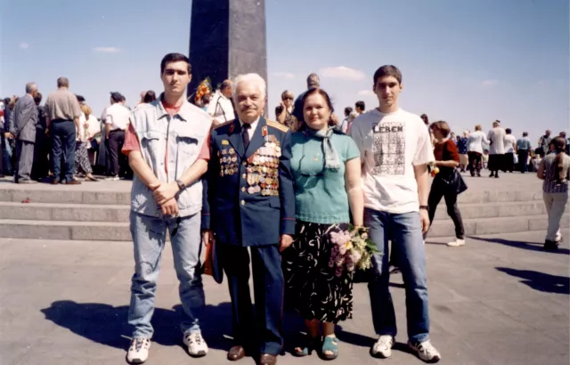 This is I, Hertz Rogovoy (2nd to the left) with my relatives in Kiev Park of Honor by the Obelisk to the Unknown Soldier. From left to right: my older grandson Yuri, I, my daughter Irina, my junior grandson Igor. I have the following awards on my jacket: three yellow stripes standing for severe wounds. Red stripes stand for minor injuries. Blue ones stand for contusions, I do not wear those. My awards from top to bottom, from left to right: Great Patriotic War Order of the 1st class, Great Patriotic War Order of the 2nd class, Red Star Order. Below are honorary awards and insignia: Guards insignia, Veteran of the 62nd Guards Army under Chuykov's command, Veteran Council insignia, medals and insignia devoted to memorable victory dates and USSR memorial dates. To the top left side there are Ukrainian awards: the 1st row- Cross for the bravery, medal "To the Defender of the Motherland", medal "60 Years Since Kiev's Liberation". The second row: order of the Military Red Banner, medal "For the Bravery", 2 medals "For military merits", "for Battles for Moscow", "For Stalingrad Battles", Pole Cross for the Merits, medal "For Kiev Liberation", "For Defeating Germany". The rest of the medals are devoted to the anniversaries of the Soviet Army, medal "Labor Veteran", 2 Israeli medals: the 50th and the 55th victory anniversaries. Totally I have 30 medals and 5 military orders. The picture was taken on May 9, 2002.