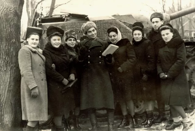 These are my fellow-students. I, Hertz Rogovoy am in the center. The picture was taken in the institute park after we had passed the last exam in 1948 in Kiev. The girl wearing a white kerchief on my right is Mira Stillman from Kiev, born in 1925, she was a physician, lives in Kiev, during the Great Patriotic War she evacuated to Ufa, beside her Liudmila Prihodko. On my left is Lilia Triger, evacuated to Kazakhstan during the Great Patriotic War. The guy on my left is Alexandr Shakenov - Pogrebitskiy, a former infantry guy, invalid of the war grade II (was wounded in his arm, had bones broken and nerves affected), physician, he may have passed away. I remember nobody else.