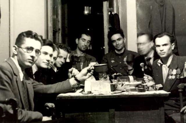 This picture was made in the hostel of medical institute in Kiev. I am, Hertz Rogovoy, in the center of the table, 6th from the right. After the war was over in 1946 I was sought by the military enlistment officers and was apprised of being awarded with the Great Patriotic War Order of the second degree for the last battles by Kusk. I was not conferred the order as I was wounded and hospitalized. At the end, I was awarded in the Ministry of Defense. The front-line soldiers, my institute friends, got together to mark this event. There are students-war veterans at the table, first from right is Victor Voevodin having the Glory Order on his chest, he is one course older than me. Victor Paklay, a legless war veteran, is next to me. Yuri Dusho is first from left. I do not remember other students' names, so many years have passed. The picture was taken in Kiev in the hostel of medical school, in 1946.