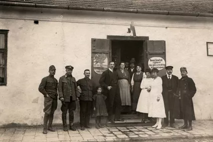 "This photograph was taken at the beginning of the 20th Century in Trnava, and shows the pub HOSTINEC U ZELENEHO STROMU [THE GREEN TREE INN] that belonged to my grandpa, Bernat Grunfeld. Written on the door is: We serve wine, beer and various spirits. My grandfather is fifth from the left in the photo, and standing to his left is his wife. I don’t know who the other people are.
