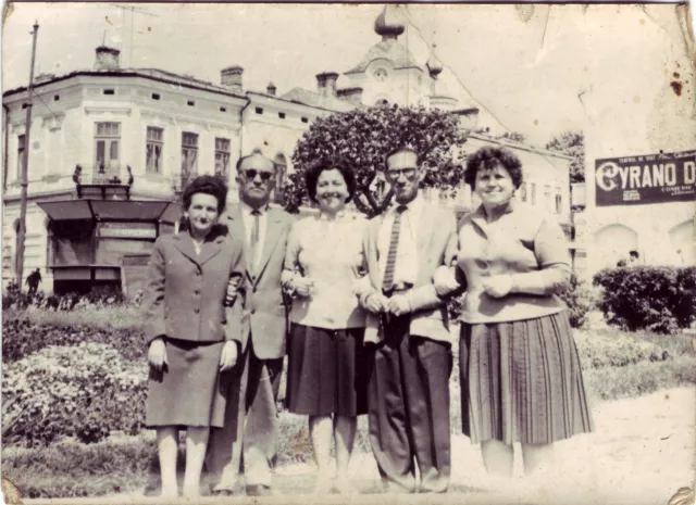 This picture was taken in Botosani in 1958 or 1959. The corner that is visible behind us no longer exists – it got demolished. I, Rifca Segal, am the one on the right. From me to the left there’s Isac Milstein, the husband of a very good friend of mine, Minuta Milstein, who’s the first from left. The second one from left to right is my husband Iancu Segal. The one in the middle is Bella Rapaport.