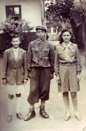 This is me, Ietti Leibovici, on the right, with a childhood friend, Eti Vitof, and her brother, Benu Vitof. Eti Vitof was as old as me, we went to kindergarten together, and were also classmates in school, and we got along very well. But she left to Israel with her parents, brother, and another sister, I believe. This photograph was taken in Vatra Dornei when I was 16, after returning from the deportation. My father and I lived at a relative's in Vatra Dornei for more than a month after World War II as well. The photograph might have been taken by a photographer.