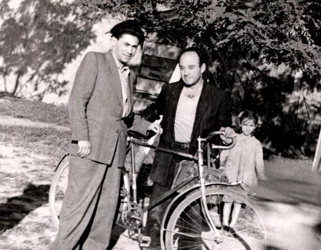 This is me, Ignaz Neubauer, on the left, beside me on a bicycle - a plumber from Uzhgorod, a Jew, whose surname was Preis. I stopped to talk with him in one of the streets in summer, when my colleague passing by photographed us. All I can say about Preis is that in 1943 he crossed the front to join the Russians and spent many years in a camp for the illegal crossing of the border. I don't have any information about what he did afterward. After his release from the camp he settled down somewhere in the Far East. His family perished during the Holocaust. My acquaintance, who photographed us, kept this photo, and he gave it to me after WWII in 1946.