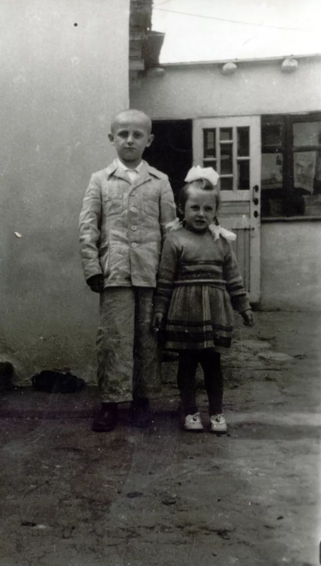 This is me, Igor Brover and my sister Rosa Garysheva. This photo was taken in Ursat'yevskaya town, Tashkent region (Uzbekistan) in 1943. We are standing in the yard of the house where we accommodated in the evacuation. Behind us is the front door to the annex building where we had our room. This photograph was made to be sent to my father at the front.