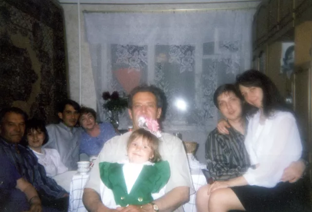 This is me, Igor Brover, and my wife Alla Brover with the family of my sister Rosa Garysheva. This photo was taken in Ilichevsk in 2003. From left to right: my sister Rosa's husband Anatoliy Garyshev, my niece Victoria Yablonskaya, her husband Pavel Yablonskiy, my wife Alla Brover, my niece Yulia Vozovikova with her husband Yuriy Vozovikov. I, Igor Brover, holding my grand niece Irina Yablonskaya am in the foreground. This photograph was taken at a family gathering in the apartment of my sister Rosa Garysheva.
