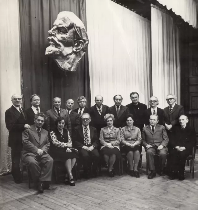 This is me (sitting first from the left) with a group of Jewish writers. This photo was taken in Chernovtsy in 1976. Second from the left sitting is Sidi Tahl, an actress of the Jewish theater, third from the left sitting is chief editor of the ‘Sovietische Heimland’ magazine Aron Vergelis.