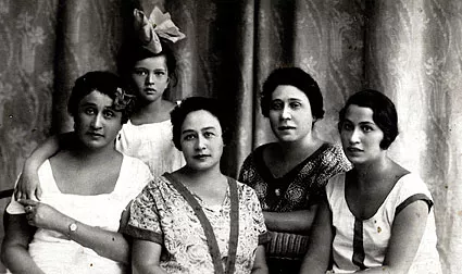 My father's sisters: sitting from left to right are Vera Rubinshtein, Maria Wasserman, Bertha Rozenfeld, Vera's daughter Anna Rubinshtein is standing. This photo was taken in Feodosia, in 1926, when she was visiting Maria.