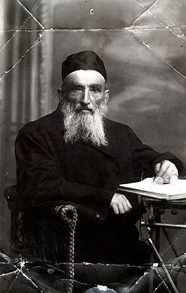 My maternal grandfather Iona Wolfenfeld. This photo was taken in Zamost'ye town in Poland, around 1920, Strizhevskiy studio. My grandfather is rather old, looking 65-70 years old, having gray hair and a big gray beard, wearing a kippah and a long jacket, reading a big book - perhaps this was a Torah book, having his glasses on it.