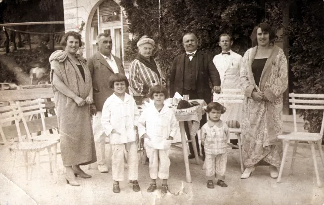A family portrait, taken on holiday in Abbazia in the 1920s. Top row, left to right: my mother, an unidentified man, grandmother Riemer, grandfather Riemer, a waiter, and mother's sister, my Aunt Klari. The children at the bottom are (left to right) my sister, me, and Aunt Klari's son.