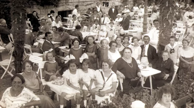 Our family on holiday in Abbazia. We are sitting in the garden of the Orthodox hotel, the Breiner. Many of my relatives are in this picture. My mother, sister and I are sitting in the front. My grandparents should also be somewhere in this photo, which was taken in the 1920s.