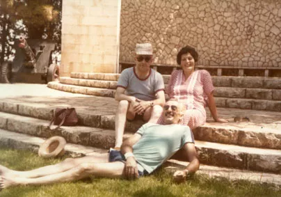 This is me, Jozsef Farkas, on the left, sitting next to me is Ibolya Farkas, my brother's wife, while in front of us is Imre Farkas, my younger brother. We are in a park in front of their house, this picture was taken there, in front of the heroes’ monument [the monument of Israel's soldiers] in Kefar Sava, in the 1980s.