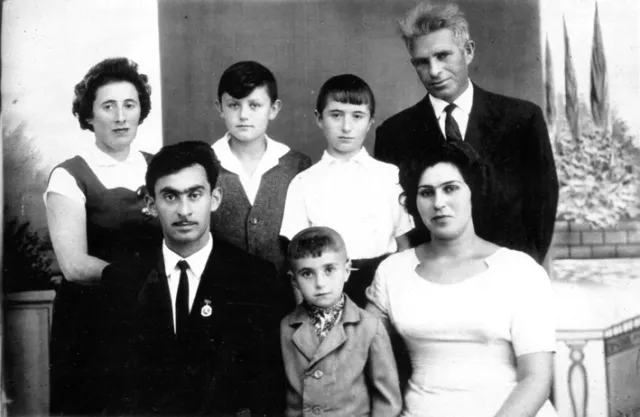 Sons and daughters of my Uncle Haim (my cousins) and their families. From left to right (sitting in the first row): Izia (Isaak) Vitkin, Uncle Haim's son, his son Fima and his daughter Maria. Second row: Zina, Lev's wife, Yuri, Ida's son, Felix, Lev's son, and Lev, Haim's son.