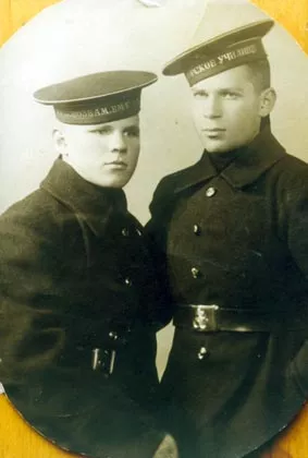 This photograph was taken in Leningrad in 1941 in a photo-studio. We went there together with my comrade Romanov. We are the 1st course cadets of the Naval School named after Frunze.