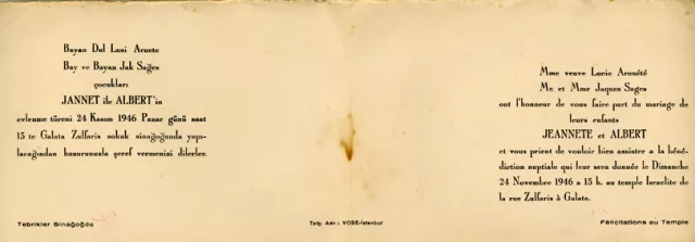 The engagement party took place in an establishment called Belle Vu.  I don't even remember if there were rings exchanged.  We got engaged on June 24th, 1946,  the civil marriage was on October 24th, 1946, and the wedding on November 24th, 1946 in the Zulfaris Synagogue (Zulfaris Synagogue was on the synagogues in Istanbul.  This synagogue was turned into the 500th Year Foundation Museum  in the last few years).  One of the most famous traditions of Bursa was the showing of the dowry. My mother prepared a beatiful dowry, the dowry was shown in the accompaniment of the lute.  My mother-in-law did not pay much importance to such stuff.  She had just been widowed when I got married anyways.  She did not have the state of mind to deal with this stuff.  But tradition was tradition and it was done.  A black coat, light-colored coat, black suit, light-colored suit, silk broidered nightgowns, tablecloths were integral parts of a dowry.  On the wedding night we went to the Park Hotel (in Taksim, one of the most luxurious hotels of the time) in great secrecy.  The two of us were alone and no one had been made aware.  I still haven't understood the reason for this secrecy.  Nothing was ever told to anyone in the family.  As if, if it was kept secret and nobody knew, my husband's business would go better.  He thought this way.  He was afraid of a lot of things, the evil eye, the jealous eye, he did not like to be talked about.  From this point of view, he would do everything in secrecy, and prevent being talked about in his own way.
