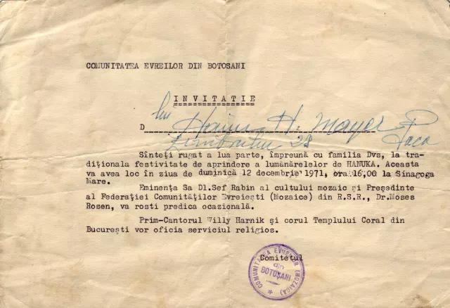 This is an invitation sent by the Jewish Community of Botosani for us to take part in the lighting of the candles on Chanukkah.