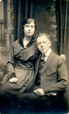 This is my father’s elder brother, Iosif Grunberg and his wife, Ani Grunberg. The photo was taken in 1919 in Philadelphia, and they sent it to my father. It says on the back: ‘souvenir from your brother and sister-in-law, Joseph and Ani, Philadelphia.’ They were already married at the time, if you look closely, you can see their wedding rings. Ani was from Bucharest, and she worked as a dressmaker, and Joseph was a photographer. They have two children, Sophie and Evelyn.
