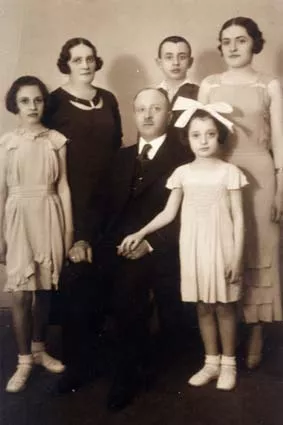 This photo pictures my parents, Iosif and Minta Tucarman, and their four children: Fanny called Nutzy (on my father’s left), Betty (first from right), me, Iancu Tucarman (behind my father) and Sofia (behind Fanny). This photo was taken in Iasi in 1932 at a studio called Foto Select on Cuza Voda Street. The photographer was deaf and dumb. He spoke very slowly, barely understanding the words. He could not pronounce the word ‘smile,’ he could only say ‘smi.’ He was a great man and most demanding. One can see how skilled he was in taking photos.