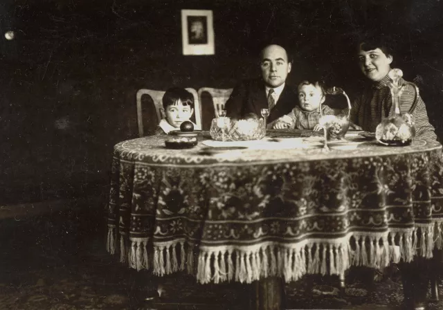 In this picture our family is having tea in the evening. We are sitting at the table covered with velvet table cloth, whereon there are beautiful dishes- carafe, crystal plate etc. My parents Taube and Abram Yudelevich, I and my elder brother David are at the table. The picture was made in our hous in Kaunas in 1933.