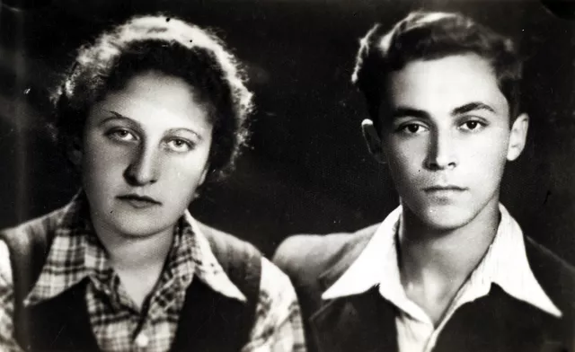 This is a picture of me, Irena Wygodzka, with my frist love: Dudek Goldberg from Radom. I met him in Vilnius, in the kibbutz. This is where the picture was taken, in 1941.