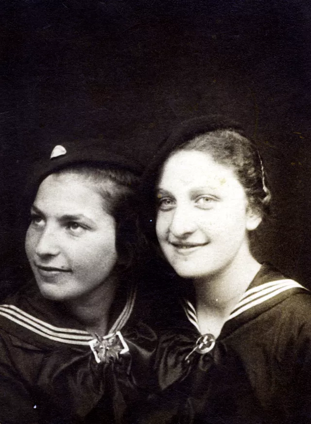 This is a picture of me with my friend from school, Mala Lobel. I am on the right and Mala is on the left. This picture was taken in 1938, we are both wearing school uniforms.