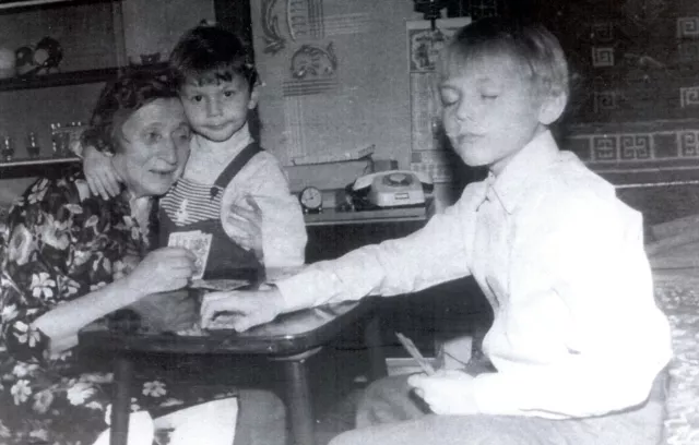 My mother Hava (Eva) Ozer and her great grandchildren - my grandchildren Andrey and Sergey Penkin playing cards photographed by my son in my apartment in Lvov in 1985.
