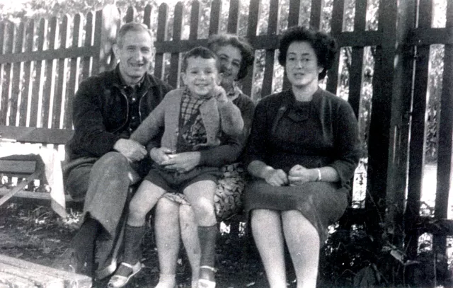 This photo was taken at the dacha in Yurmala where my parents spent their vacation. We were visiting them, and my husband photographed us. From left to right: my father Boris Mikhelson, my mother Rachil Mikhelson holding my son Alexandr, and I. This photo was taken in 1969.