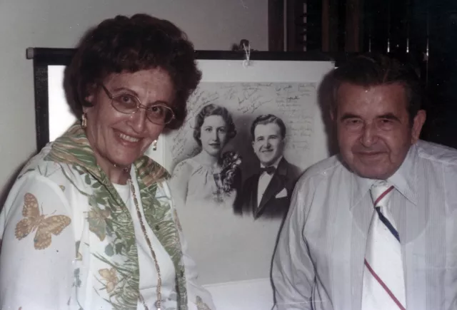 On this photo my brother is already an old man. On his left you can see his wife Ester, who was born in Poland in 1912. She was a housewife. She died in the USA in 1999.