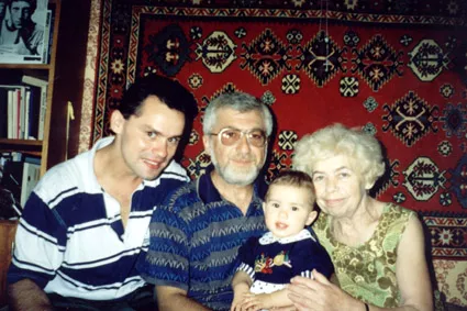 I, Isabella Lerman, on the left, my brother Roman Lerman is beside me, my son Victor Karanchuk is on the right and I'm holding my older granddaughter Anna Karanchuk. This photo was taken at my home in Kiev in 1997.