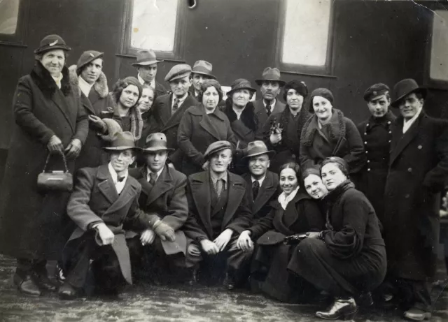 This is a picture from 1932, when we were to become soldiers. The picture was taken in Sofia. I am the sixth from left; second from left is my good friend Nissim Benbasat. There are no relatives of mine in this photo. Most of the people are relatives and friends of Nissim Benbasat. Behind us is the old building of Sofia Central Railway Station. We left for Vidin, where I was released from work due to an illness and came back to work in Sofia because at that time I provided for the whole family.